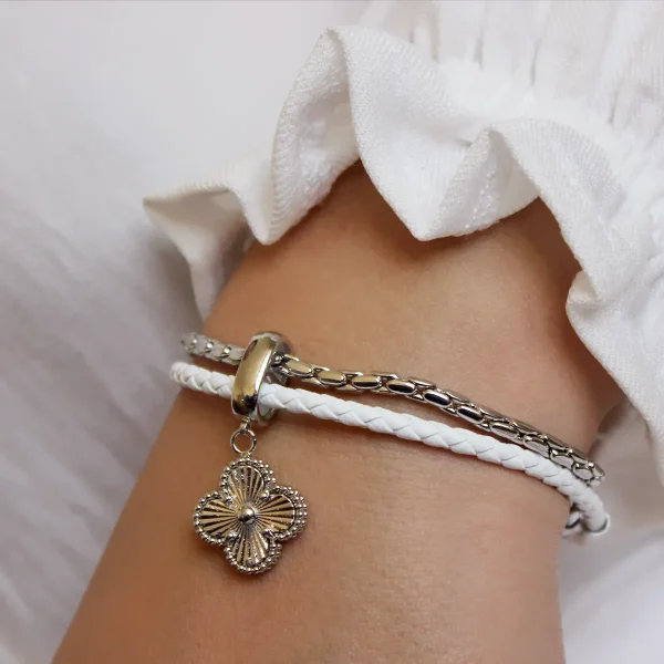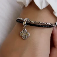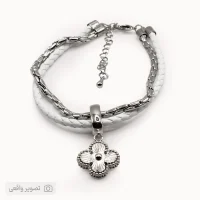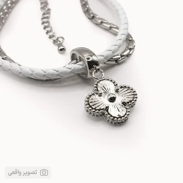 • آویز چهاربرگ طرح ونکلیف: این آویز کوچک اما برجسته، با جزئیات دقیق، همان طرح پرفروش برندهای لوکس را تداعی می‌کند و تصویری دلربا از این دستبند ونکلیف بدل ساخته است.