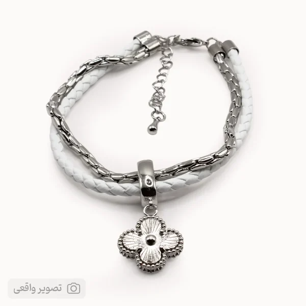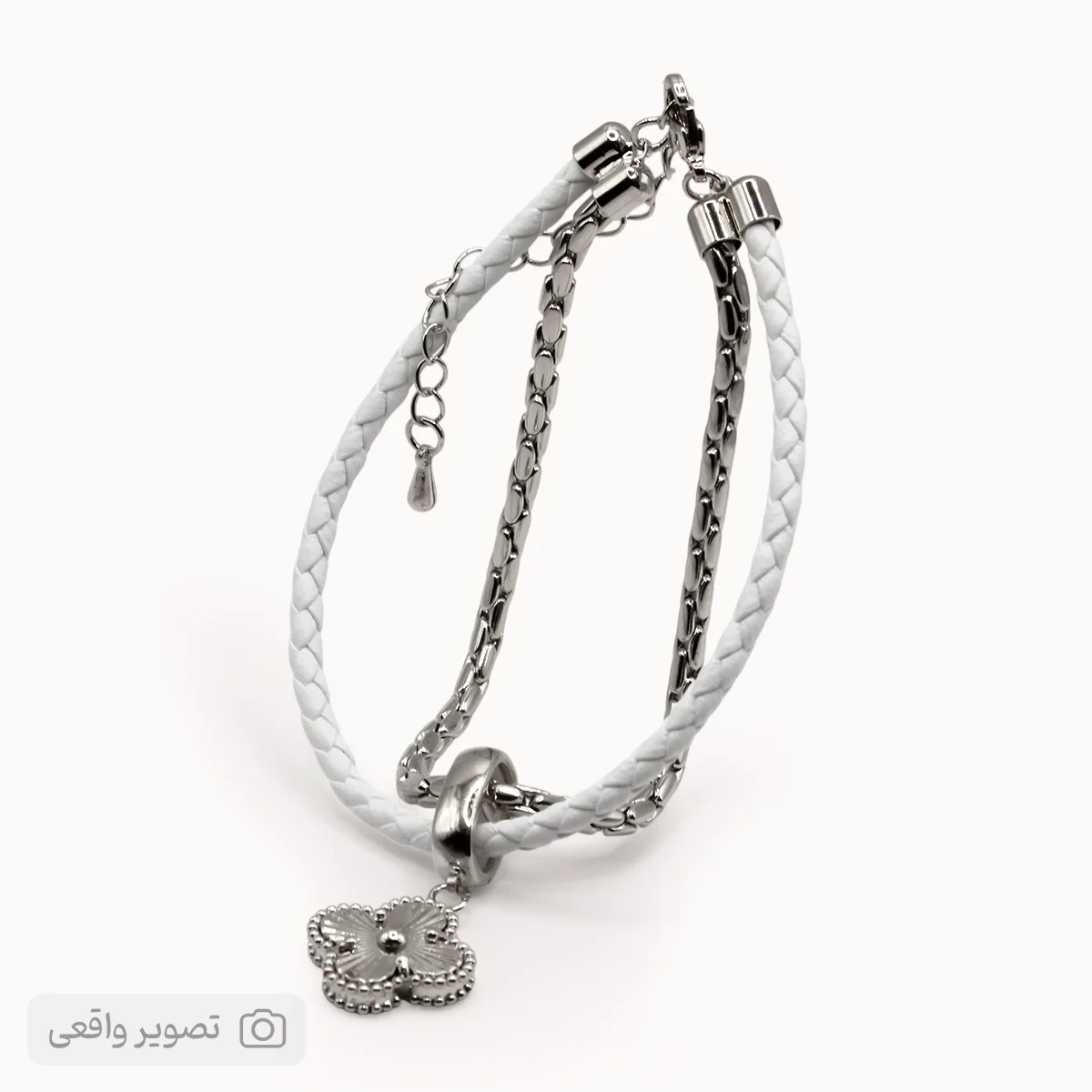 • رشته چرم بافت‌دار: در دو رنگ سفید (برای استایل‌های روشن و تابستانه) و مشکی (برای تیپ‌های رسمی یا شبانه) به کار رفته که با حس طبیعی چرم و بافت پوست ماری، جلوه‌ای گرم، دلنشین و لوکس به مچ دست می‌بخشد.
